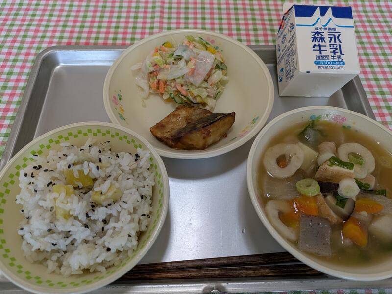 今日のメニューは、栗ご飯、つぼん汁、アジ胡麻フライ、千草和え(ピーナッツアレルギー対応は、ピーナッツなし。)、牛乳でした。