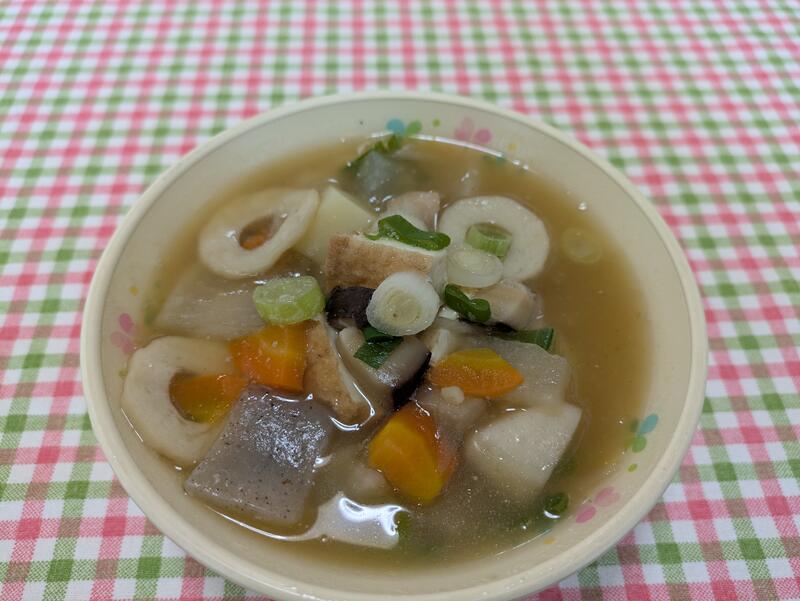 横島小ののっぺい汁は、大根、人参、ごぼう、ジャガイモ、蒟蒻、ねぎ、椎茸、鶏肉、油揚げ、豆腐とたくさんの種類の具材が入った栄養満点のおいしいのっぺい汁でした。