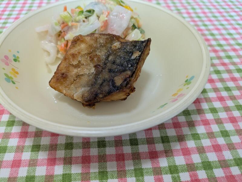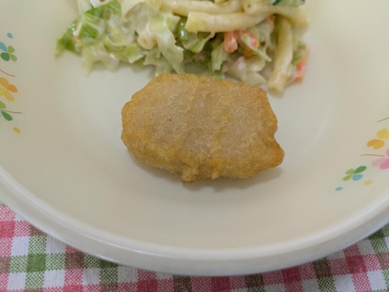 マカロニサラダも、子どもたちの人気メニューで、マヨネーズにツナをからめて味付けしてあり、マカロニに胡瓜と人参がとてもなじんでいて、これまたおいしかったです。