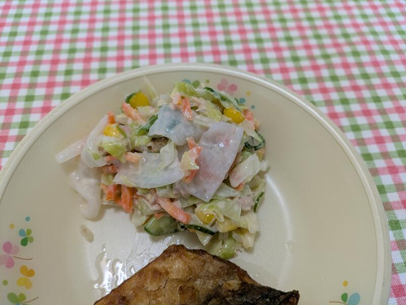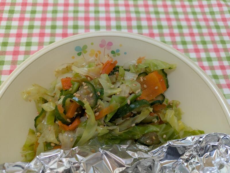 おかか和えは、おかかを火に通してからキャベツや胡瓜、胡麻と和えてあり、子どもたちのために丁寧にこしらえてありました。愛情を感じながらおいしくいただきました。