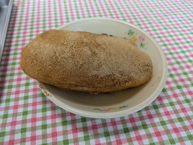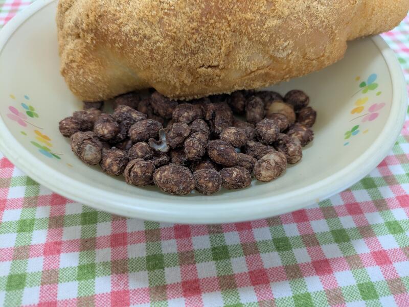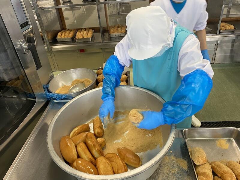 そして、きな粉と砂糖、黒砂糖、塩を横島小伝統のレシピにそって混ぜた揚げパン粉に、揚げたコッペパンをからめます。そうすると、とってもおいしい揚げパンができあがります。
