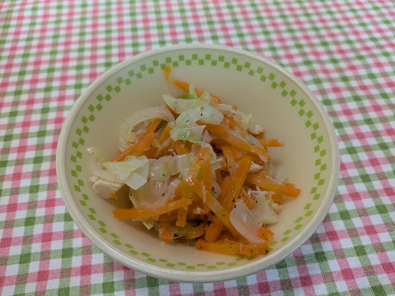 横島小の千草和えは、人参、キャベツ、チンゲンサイに、チキンハムとピーナッツを混ぜて子どもたちに合う味付けで和えられていました。栄養バランスのいいおいしい和風サラダでした。