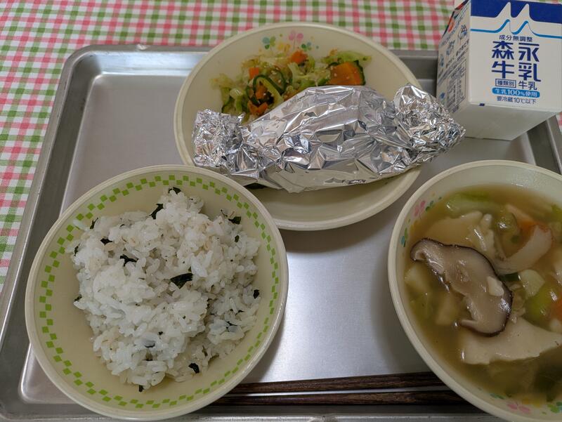 今日のメニューは、麦ご飯、のっぺい汁、鰯の梅煮、胡豆昆(ごずこん)サラダ、牛乳でした。