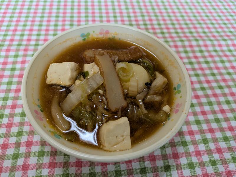 豆腐汁は、鰹と昆布の出汁と薄口醤油の味加減がとてもよく、「畑のお肉」と言われタンパク質がたくさん含まれる、地元の山本豆腐さんのおいしい豆腐が、人参やチンゲン菜、油揚げの具材の旨味と絡まって、健康的でとてもおいしい豆腐汁でした。