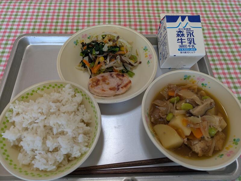 肉じゃがは、日本の家庭料理で大人気メニューです。横島小の肉じゃがは、湯気が出るほどの温かさでいただくことができます。自校式給食のすばらしいところです。その上に、今日の肉じゃがは、醤油ベースの子どもが喜ぶ甘辛さで味付けしてあり、具材からの甘みもとてもよく出ていました。その旨味が、じゃがいもにしみ込んでとてもおいしかったです。
