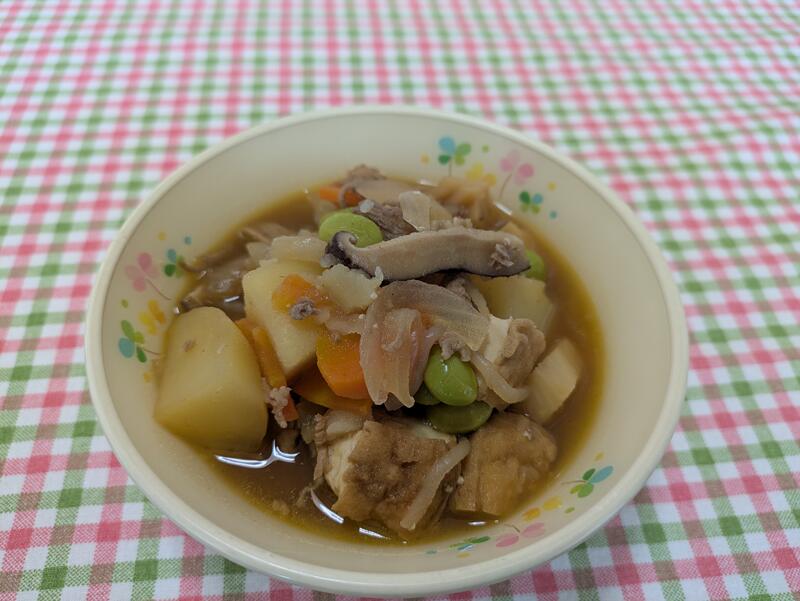 えのきのみそ汁は、JA横島女性部からいただいた手作りの味噌を使ったみそ汁でした。いつものおいしいいりこの出汁が、手作り味噌の甘みとともにえのきやじゃがいも、人参、玉ねぎ、豆腐、油揚げにしみ込んでとてもおいしいみそ汁でした。
