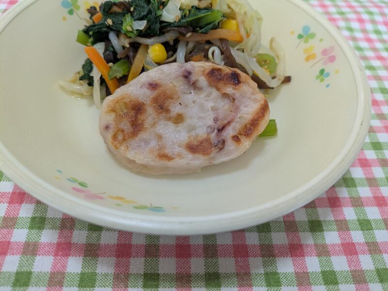 豆腐ハンバーグは、子どもたちに人気で、醤油がベースの手作りの大根おろしソースの甘辛さがハンバーグにとても合っていて、子どもたちも先生方も喜んで食べていました。
