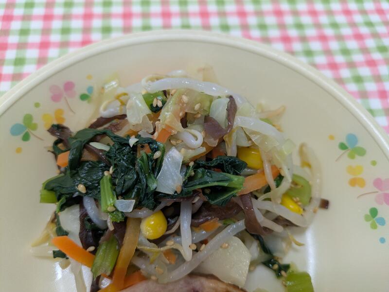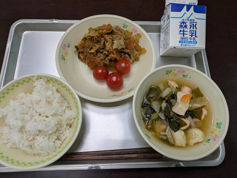 豚肉の塩麹炒めは、塩麹に浸した豚肉と玉ねぎ、小松菜、もやし、にらに茎ワカメが炒められていて食感もよく、具だくさんで、いい塩加減の子どもたちも喜ぶおいしさでした。