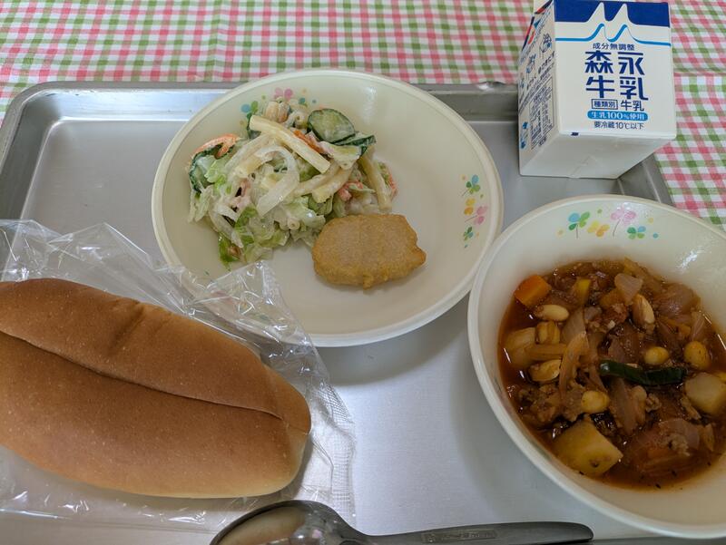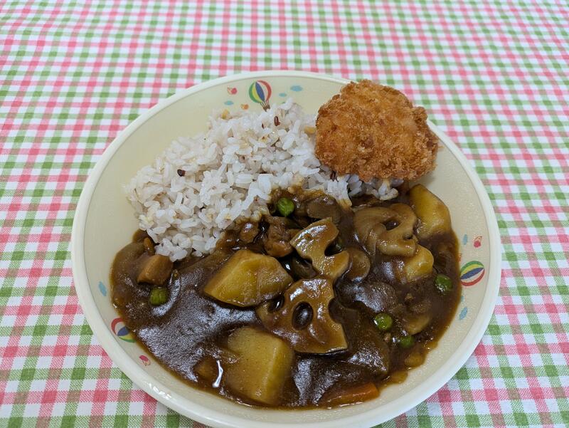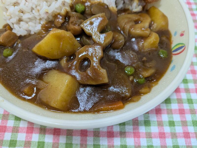 今日の横島小のポークカレーは、いつもよりルーが濃厚で、豚肉や野菜にとてもよく絡んでいて、特にホクホクしたじゃがいもにしみ込んでいておいしかったです。隠し味にりんごをすりおろして入れてありました。