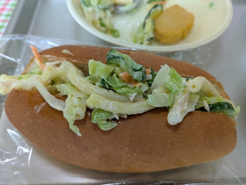 ブロッコリーサラダは、高値が続く野菜のブロッコリーやキャベツ、人参がたくさん入っていて、それに栄養価の高いひよこ豆もたっぷり入っていました。その上にツナが混ぜてあり、味付けも子どもたちが喜ぶような甘酸っぱさでとてもおいしかったです。