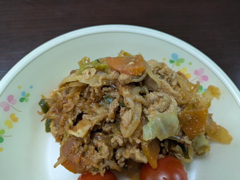 今日は、ポークカレーでした。私の大好物のカレーで、中でもポークカレーが一番好きです。その上にトンカツまで出ました。トンカツも大好物です。