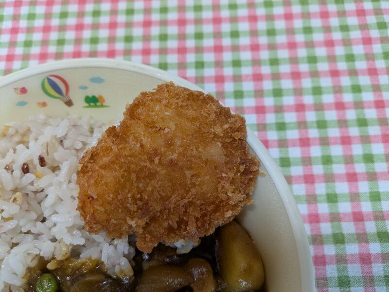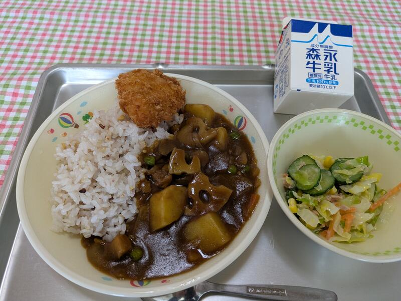 今日のメニューは、雑穀ご飯、ポークカレー、トンカツ、大根サラダ、牛乳でした。