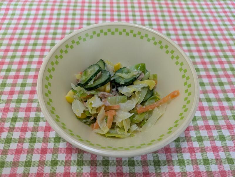 コーンサラダは、子どもたちが大好きなコーンがたくさん入っていて、愛情たっぷりの手作りドレッシングかけてあり喜んで食べていました。