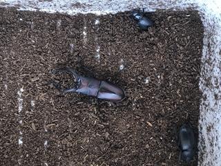 8月14日(金) 昨日のことになりますが、お盆なので納骨堂にお参りに行きました。そのときの景色があまりにきれいだったので、紹介します。外平山から小学校や有明海の方向を写したものです。もう一枚は、その帰りに捕獲したのこぎりクワガタの雄と雌とコクワガタのメスの3匹です。