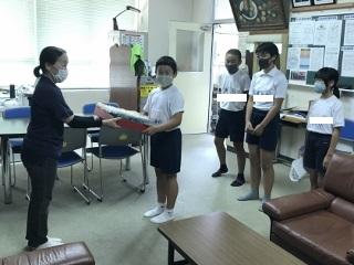 8月21日(金) JAたまなの女性部横島支部より新型コロナ感染症予防のためのマスクの贈呈がありました。マスクは、子供達に人気のアニメ「鬼滅の刃」の模様で、子供達は大喜びでした。部長の孝富士様、事務局の木村様がおいでになり、運営委員の子供達が受け取りました。制作には、10名弱の女性部の方が、1週間ほどかかったそうです。大変ありがとうございました。