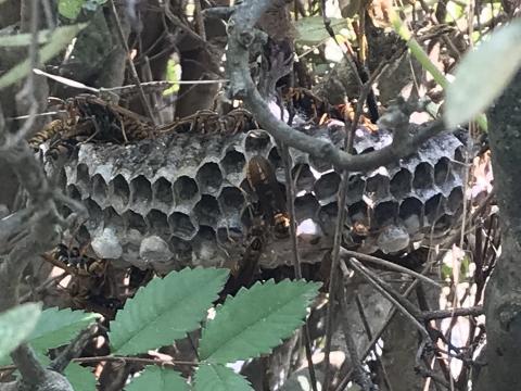 8月21日(金) 昼休みに、グリーンステージの植え込みに蜂の巣ができているという報告がありました。退治に行ってみてびっくり直径20cm以上はある大きな蜂の巣でした。アースジェットで退治しました。子供達が刺されなくて良かったです。