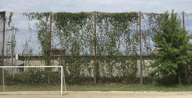 9月1日(火) 下の写真を見てください。運動場の国道側のフェンスです。一番上まで、ツタorツルが伸びています。今日途中を全部切りましたので、数日後には枯れてくるのかなと思っています。