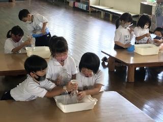 9月10日(木) 5校時授業を見て回っていると、4年生が廊下で理科「雨水の行方」の実験をしていました。砂を入れたコップに水を入れて、どんな風にしみこんでいくかを観察していました。