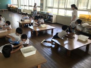 9月14日(月) 子供達の多くは、どんなに暑くても屋外で遊んでいます。バッタを捕まえて見せてくれた子もいました。今日は、教室で過ごしている写真も一枚入れています。