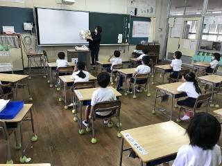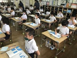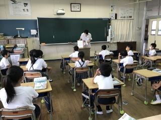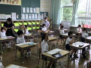9月4日(金) 今日は今年度初めての読み聞かせでした。感染予防のため前に集まらずにマスクを付けたままで行っていただきました。子供達は、とても楽しみにしていたので、大喜びでした。私のミスで一学級写っていませんでした。申し訳ありません。