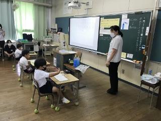 9月3日(木) 3校時、1年2組で、算数「どちらがおおい」の研究授業がありました。1年生は、今年度、学びを初めて3ヶ月ほどしかたっていないのに、「めあて」「見通し」「自分で」「みんなで」「まとめ」「適用問題」「振り返り」に沿って、学習が進んでいました。感心しました。実験の場面では、友だちと協力して活動できていました。