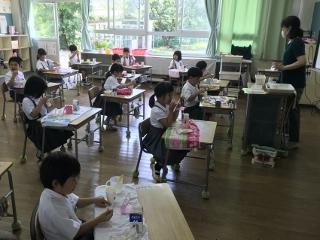 7月31日(金) 給食の準備と食べているところの様子です。現在は、1年生、2年生、4年生がランチルームで給食を食べ、他の学年は、教室で食べるようにしています。