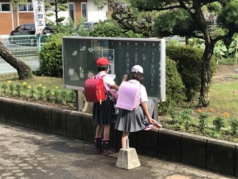6月19日(金) 今日も又掲示板を記入していました。毎週忘れず記入している後ろ姿に感動しています。他にも毎朝、旗を立ててくれている児童もいます。次は、その場面を紹介したいと思います。