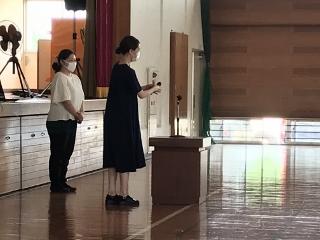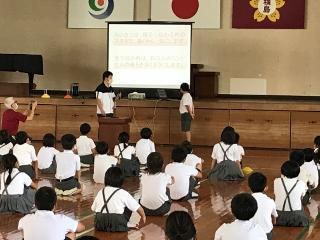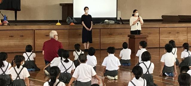 7月1日(水) 本校の橋本さとみ栄養職員が、産休でお休みされるのに伴い、新しく西岡沙央理学校給食栄養士が勤務を開始されました。橋本先生も7月22日までは勤務され、確実に引き継ぎをしていただきます。今日の集会の中で、子供達にあいさつをしていただきました。