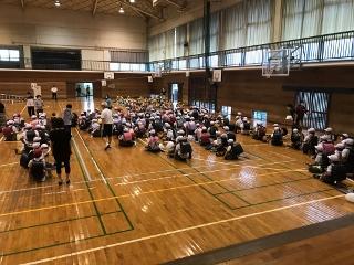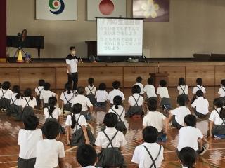 7月1日(水) 7月集会を体育館で1mの距離をとりながら行いました。内容は、私からは、コロナ感染症の流行の中、どのように過ごしていくか考え、考動力を高めよう。生徒指導担当からは、あいさつや登校の仕方とあいさつが上手な個人(6年生)と登校班の紹介、友だちとの距離を保つ委員会の取組、そして、1年生と新しく赴任された先生方の紹介でした。