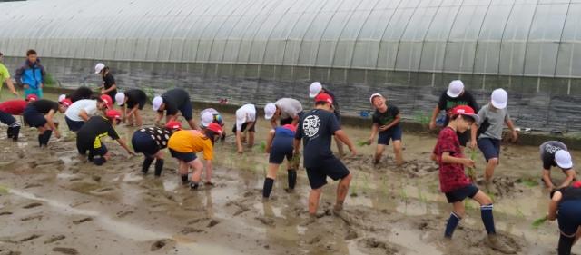 6月30日(火) 5校時、5年生が田植えを行いました。前川さんのご指導の下、4Hクラブの若手農業者の協力がありました。子供達は、貴重な体験となりました。写真は、始まるまでの写真です。植えているところの写真は、後ほどご紹介する予定です。