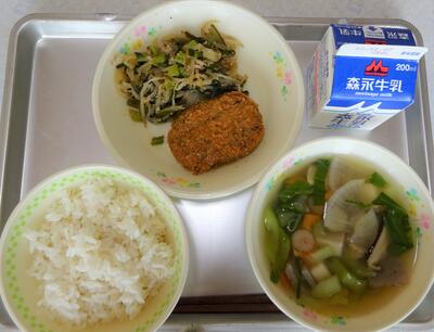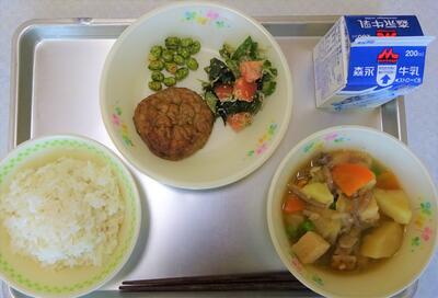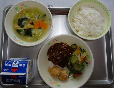 メニュー: 〇麦ごはん 〇豆腐ハンバーグ 〇甘酢あえ 〇のっぺい汁 〇牛乳