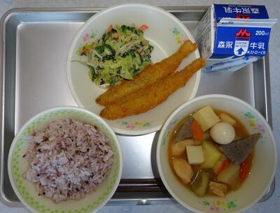 メニュー: 〇麦ごはん 〇豚汁 〇いわしのトマト煮 〇ひじきの和え物 〇牛乳