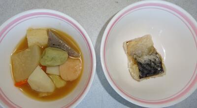 メニュー〇麦ごはん 〇けんちん汁 〇鯛のきのこあんかけ 〇白菜のおかか和え 〇牛乳