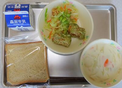 メニュー:〇黒糖パン 〇あすかスープ(除去食:牛乳抜き) 〇ちくわの磯部あげ 〇お豆のサラダ 〇牛乳