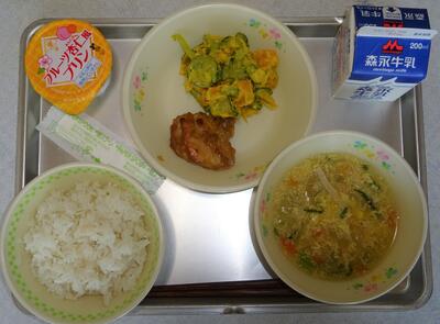 メニュー 〇わかめごはん 〇かきたま汁(除去食:卵抜き) 〇鶏のから揚げ 〇こんにゃくサラダ 〇牛乳