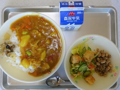 メニュー:〇麦ごはん 〇ポークカレー 〇白身魚入りサラダ 〇大豆ちりめん 〇福神漬け 〇牛乳