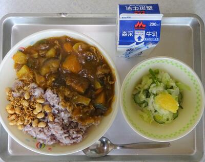 メニュー:〇雑穀ごはん 〇夏野菜カレー 〇大豆ちりめん 〇甘夏みかんサラダ 〇牛乳