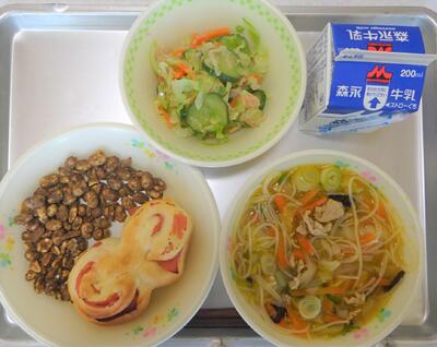 メニュー: 手作りハムロール、汁ビーフン、ツナサラダ、黒糖ビーンズ、牛乳