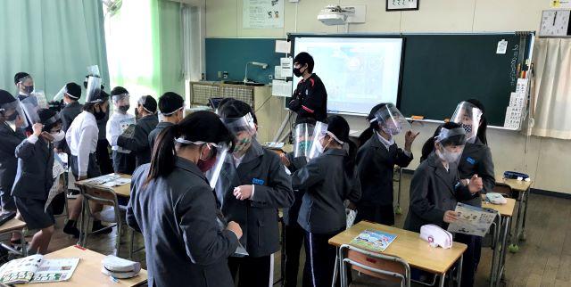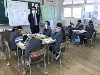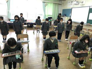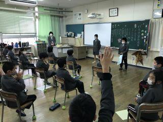 2月9日(火)4校時授業を2つ紹介します。まず、3年2組の外国語活動「What.this?これなあに?」です。丁度、フェイスシールドをつけて交流をしているところでした。2つ目は、4年生音楽「日本の音楽に親しもうです」雰囲気を出すために和服を着て指導されていました。