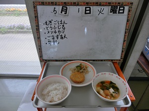 10月5日(月)横島小学校では、広いランチルームに全校児童が集まって給食を食べています。となりの給食室で、給食の先生方が一生懸命に給食を作っています。できたてのおいしい給食を毎日食べることができるこどもたちは幸せです。