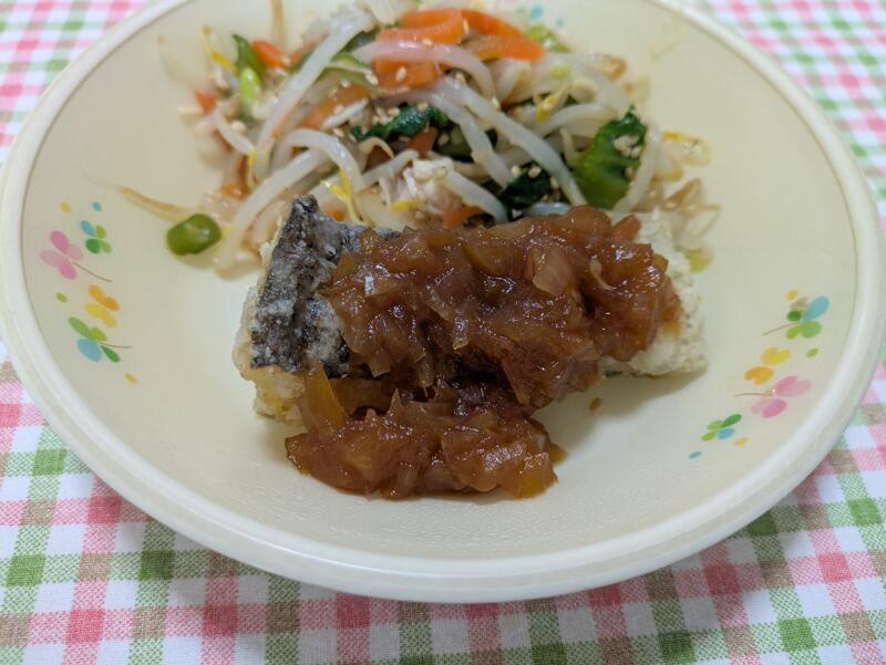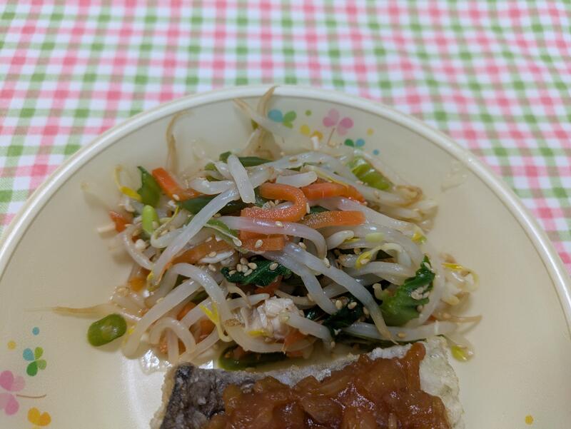 ささ身の胡麻和えは、もやしに人参、いんげん、チンゲン菜のたっぷりの野菜に、胡麻と食べやすいように鶏のささ身が混ぜてあり、子どもたちに合わせた甘酢の効いた栄養バランスのあるとてもおいしい和え物でした。