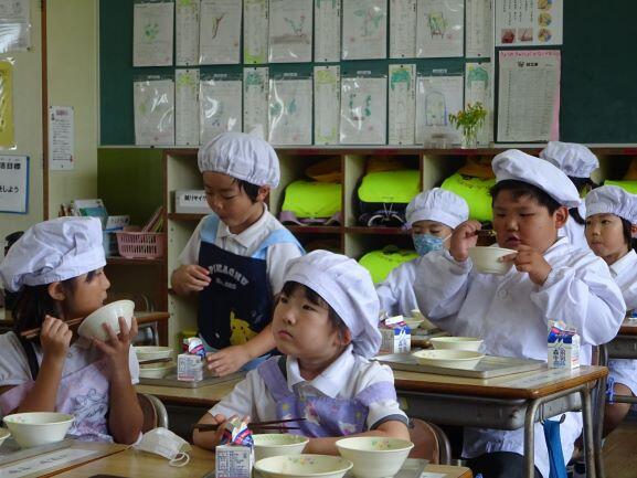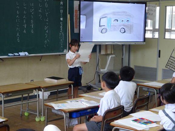 今日は、1年生の絵日記発表会と給食におじゃましました。絵日記発表会では、夏休みのできごとを発表した後、発表した人に質問をしていました。「どんな動物がいましたか。」「かき氷は何杯食べましたか。」など、いろんな質問がでていました。発表を聞いたり質問の答えを聞いたりするたびに歓声が上がり、笑顔が弾けていました。