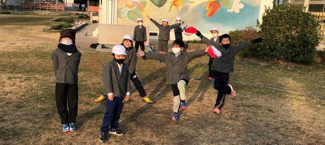 2月4日(木)朝のグリーンステージです。縄跳び大会が終わったのにまだ練習を続けている子供達がいます。もう一枚は、鬼ごっこをしていた2年生がポーズをとってくれました。