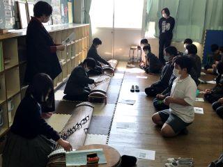 2月9日(火)4校時授業を2つ紹介します。まず、3年2組の外国語活動「What.this?これなあに?」です。丁度、フェイスシールドをつけて交流をしているところでした。2つ目は、4年生音楽「日本の音楽に親しもうです」雰囲気を出すために和服を着て指導されていました。