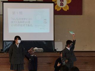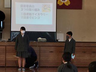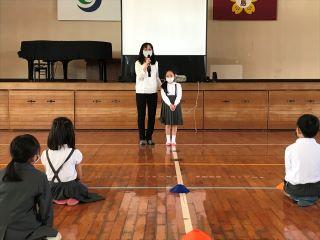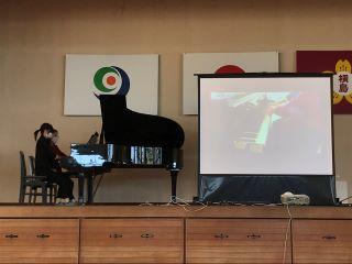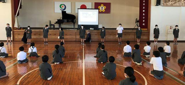 11月4日(水)5校時、11月集会を行いました。まず、私から運動会の頑張りを伝え、今後もあいさつと止まってくださった車への礼を継続していこうという話をしました。その後、生徒指導担当からコロナ感染症予防についてやあいさつについて、11月の生活目標などについて話がありました。そして、図書委員の取組についての発表と職員2名による鬼滅の刃の挿入歌「紅蓮華」のピアノの連弾がありました。子供達は大喜びでした。多くの行事が中止になる中で、子ども達に良い音楽で楽しませたいという職員からのアイディアで実現しました。大変ありがとうございました。