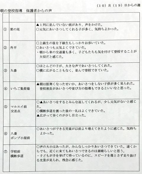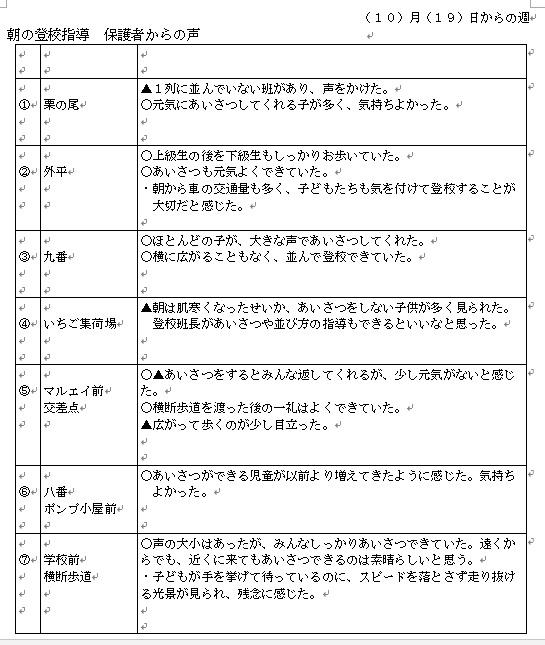 10月30日(金) 10月19日(月)の登校指導の後の声です。100点ではありませんが、子供たちは、頑張っている姿も伝わってきます。継続的に家庭・地域、学校が連携して育てていきたいですね。