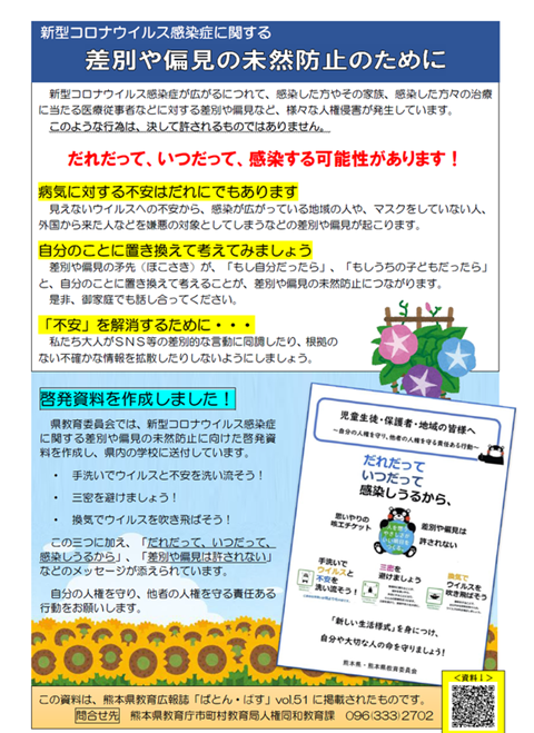 10月22日(木) 新型コロナ感染症の流行により、全世界で病気にかかる危険だけでなく、差別や偏見の広がりが危惧されています。新型コロナ感染症は、「誰だって、いつだって感染する可能性のある病気」です。現在の時点では、学校や地域からこのような事例は聞こえてきていません。学校でも「共感力」育成にあわせて取組をしていますが、家庭での指導がとても重要です。しっかり子供達と話をして頂いている成果だと思っています。啓発資料を掲載しますので、参考にされてください。