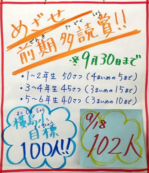 9月18日(金) 今年度の図書委員会の取組を紹介します。昨年度の多読賞の取組で、達成率が32.8%だったので、今年度の目標を40%(255人✖0.4=102人)として、”目指せ100人”を決めました。その結果、今日18日に見事達成しました。ただ、取組期間が9月いっぱいなので、新しい目標を定めて活動をするそうです。半数の128人が達成できるといいですね。明日からの4連休の間に、先日いただいた寄付金で購入した本を紹介していきます。お楽しみに!