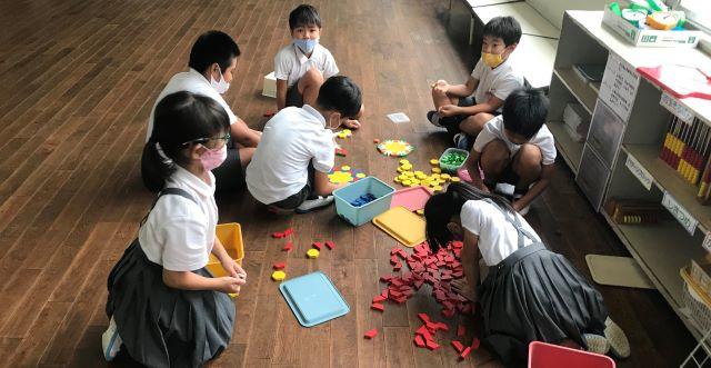 10月2日(金)3校時、1年1組が算数「かたちあそび」の中で、自分が作った形の説明を発表していました。