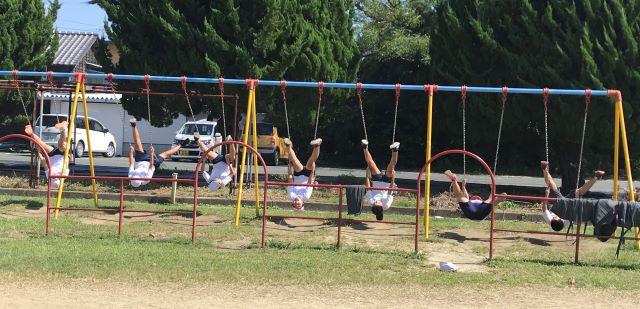 9月29日(火) 昼休み子供たちは、屋外で野球やサッカー遊び、ブランコのパフォーマンス、1年生のかけっこ、鬼ごっこ(途中で集まって)笑顔いっぱいで楽しく遊んでいました。